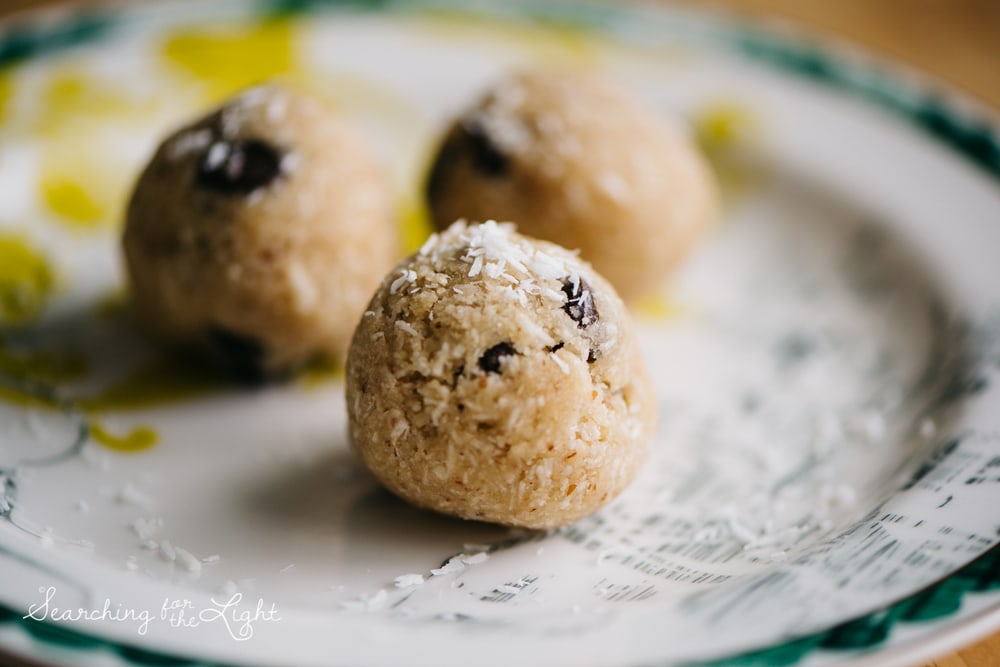 One night I stayed up late and found the perfect mixture for these chocolate chip cookie dough bites, that have no gluten, no processed sugar and are vegan and paleo friendly! Hooray!
